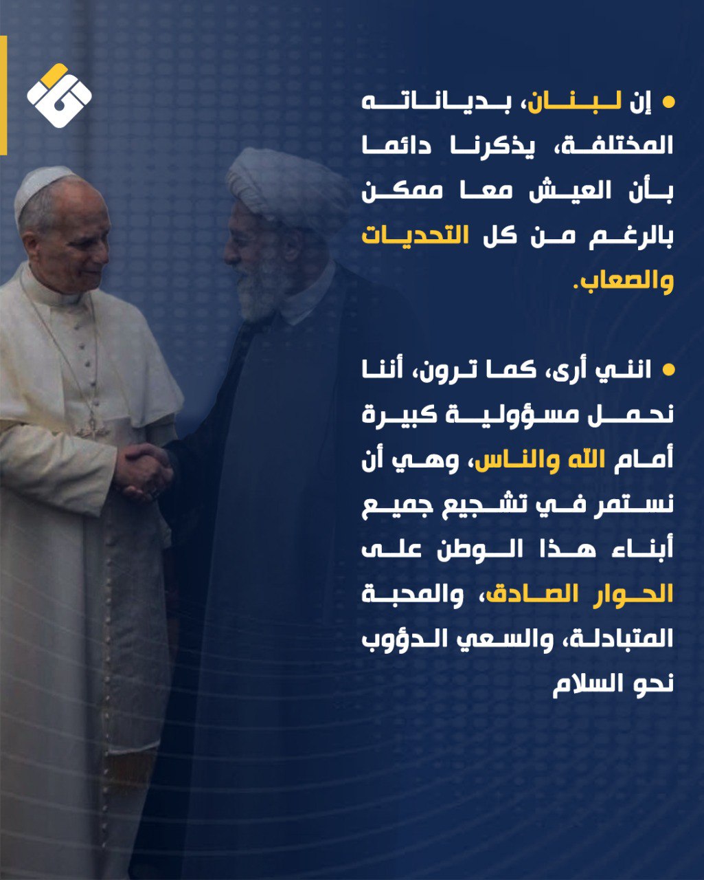 تلقى نائب رئيس المجلس الإسلامي الشيعي الأعلى العلامة الشيخ علي الخطيب رسالة من قداسة البابا لاوون الرابع عشر ،شكره فيها على مشاركته في اللقاء المسكوني واجتماع السفارة البابوية والرسالة التي سلمه إياها خلال زيارته للبنان. وقال قداسته “إن لبنان يذكرنا دائما بأن العيش معا ممكن بالرغم من كل التحديات والصعاب”.
