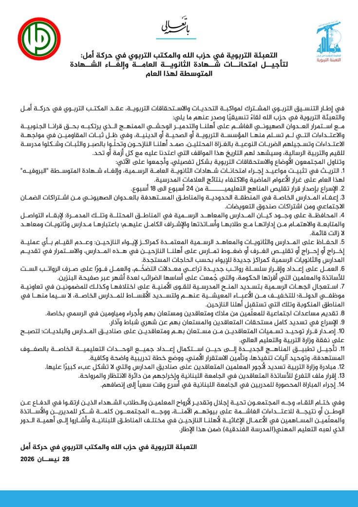 في إطار التنسيق التربوي المشترك لمواكبة التحديات والاستحقاقات التربوية، عقد المكتب التربوي في حركة أمل والتعبئة التربوية في حزب الله لقاءً تنسيقيًا وصدر عنهم بيان اشار الى انه “مع استمرار العدوان الصهيوني الغاشم على أهلنا والتدمير الوحشي الممنهج الذي يرتكبه بحق قرانا الجنوبية والاعتداءات التي لم تسلم منها المؤسسة التربوية أو الصحية أو الدينية، وفي ظل ثبات المقاومين في مواجهة الاعتداءات وتسجيلهم الضربات النوعية بالغزاة المحتلين، صمد أهلنا النازحون وتحلّوا بالصبر والثبات وشكلوا مدرسة للقيم والتربية الرسالية، وسيشهد لهم التاريخ هذا المواقف التي اعتدنا عليه مع كل أزمة أو تحد”.