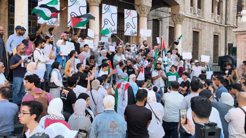 أقامت الفعّاليات السورية والفلسطينية وقفةَ احتجاجٍ غاضبة في ساحة الحجاز بدمشق، رفضًا للتطبيع مع الاحتلال الإسرائيلي، وتضامنًا مع أحرار العالم على متن “أسطول الصمود” الذي تعرّض لعدوان خلال توجهه لكسر الحصار عن غزة.