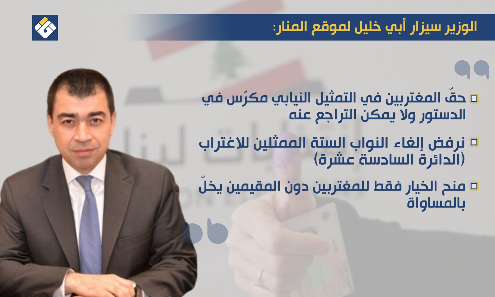 فمن جهته أكد الوزير سيزار أبي خليل في حديث لموقع المنار على أن “حق المغتربين أو المنتشرين اللبنانيين هو حقّ مكرّس في القانون، وغير قابل للتراجع عنه بموجب الدستور اللبناني، وهو ضمانة لعدم المساس بالحقوق التي مُنحت للبنانيين دون وجود ضمانات موازية ومساوية لها”.