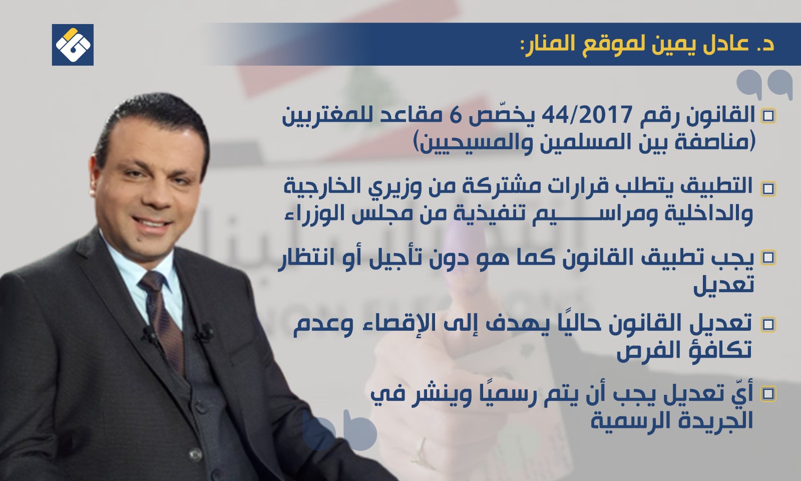 وحذّر يمين من أن “امتناع الحكومة أو الوزراء عن تطبيق القانون بحجّة انتظار تعديل جديد يُعتبر مخالفة دستورية وقانونية واضحة، وإخلالاً بالواجبات الوظيفية، قد يُعرّض العملية الانتخابية للتعطيل أو التأخير”.