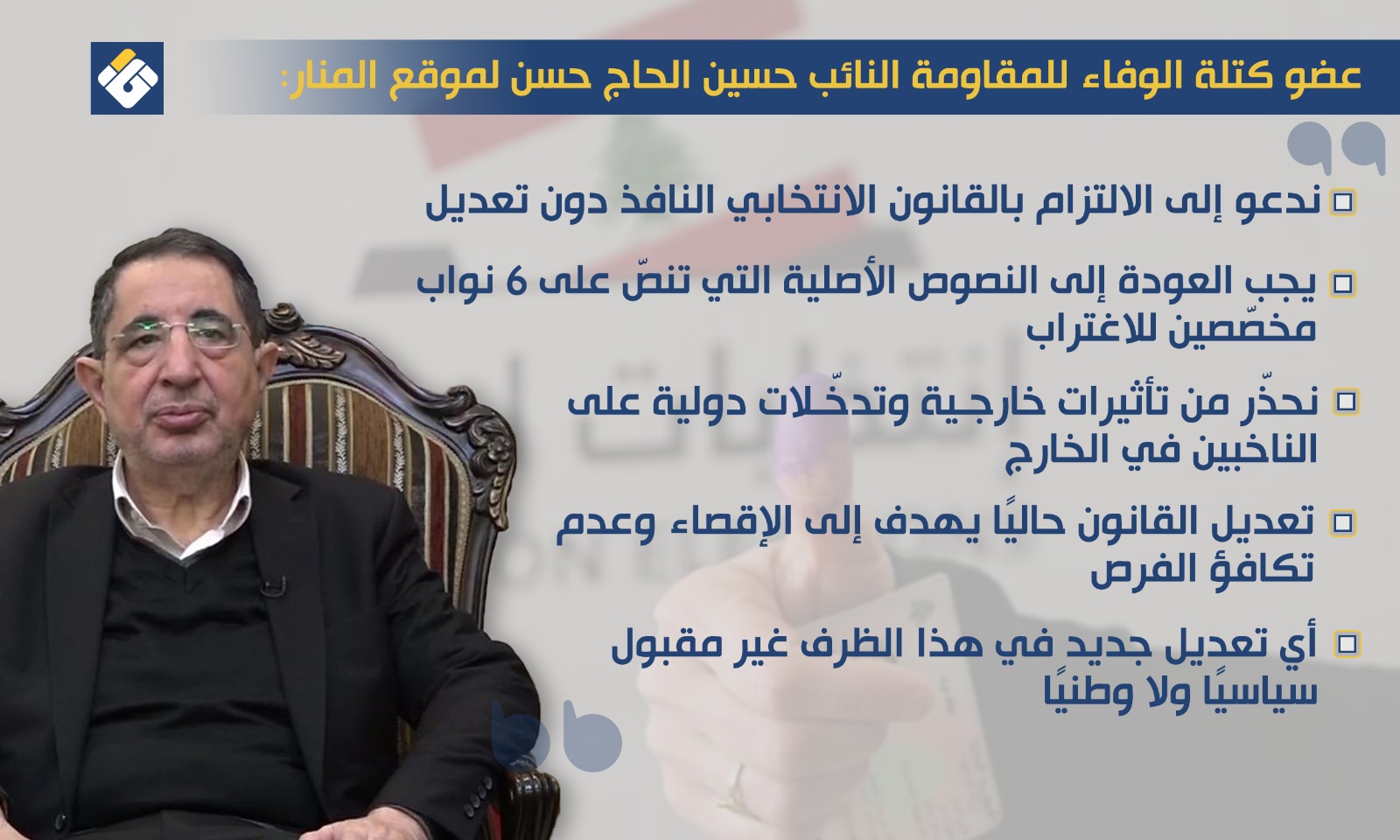وقال الحاج حسن إن “الغاية من هذا التعديل كانت استثنائية، وكان الهدف منها تمكين المغتربين من التصويت لستة نواب موزعين على المقاعد المخصصة لهم في الخارج وفق النظام المعمول به مسبقًا”.