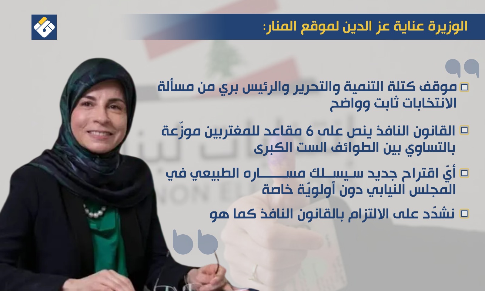وأكدت عز الدين أن “القانون النافذ حاليًا هو الذي أُقرّ سابقًا، والحكومة لم تتقدّم بأي مشروع قانون انتخاب جديد، كما لا توجد نية لتقديمه في الوقت الراهن”.