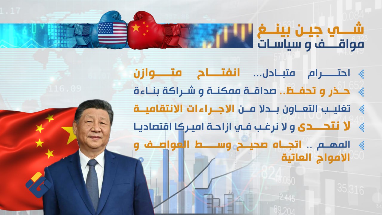 و من اللافت كان اعلان الرئيس الصيني شي جين بينغ إن بلاده لا تسعى الى تحدي الولايات المتحدة أو إزاحتها عن موقعها الاقتصادي كبديل عن محاولة حل الخلافات السياسية والتجارية والاقتصادية ، و إن على البلدين أن يكونا صديقين وشريكين ، مؤكدًا أن هذا ما تمليه دروس التاريخ وحقائق الواقع مشيرًا الى انه “علينا أن نحافظ على الإتجاه الصحيح وسط العواصف والأمواج العاتية ” وان العلاقات الثنائية بيننا يجب ان تكون دافعًا لا عقبة أو سببًا للاحتكاك” .