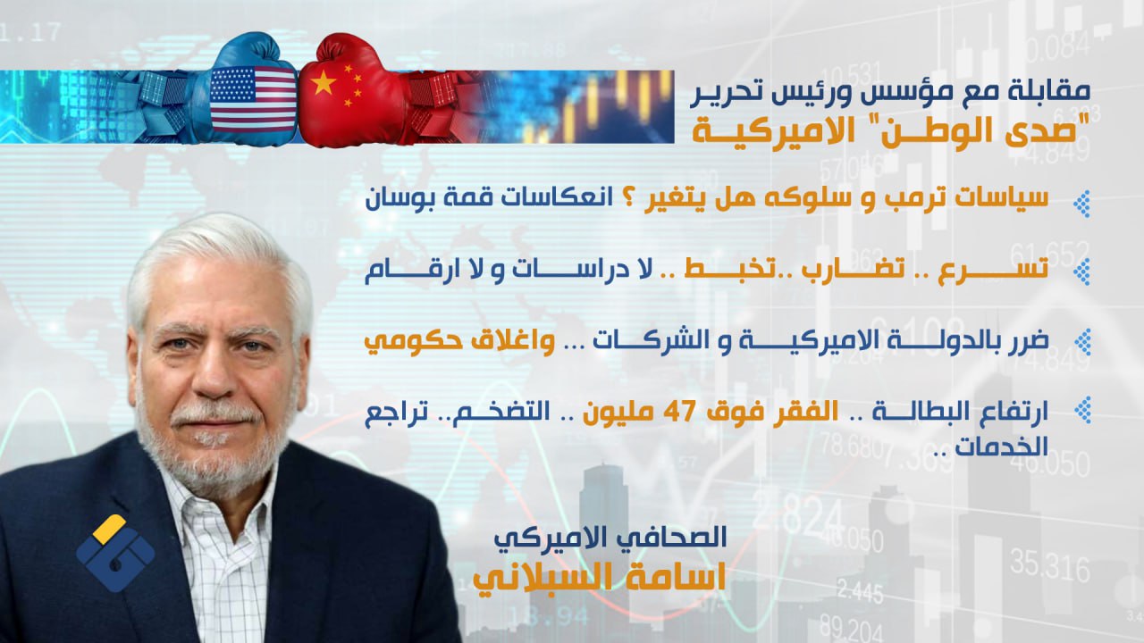 و في مقابلة خاصة لموقع المنار مع مؤسس و ناشر صحيفة صدى الوطن الاميركية أسامة السبلاني ، علق على السلوك و الأداء الاميركي الترمبي واصفا سياسة ترمب بأنها ” يشوبها التسرع و التضارب ، و مضمونها التخبط ، فهو لا يستند في أغلب قراراته على دراساتٍ معمقةٍ و أرقامٍ و استشراف ، وإنما افكار و أهواء و رغبات حتى أنها لا ترقى الى فكر و سلوك الرأسمالية او الدولة العميقة الذي يتعارك معه ترمب منذ اشهر” مؤكدًا “ان ما يقوم به ترمب مضر بمصالح الدولة و القطاع الخاص على حد سواء اذ تراجعت الصناعة و ارتفعت البطالة و تضخمت أسعار السلع و الخدمات و تراجعت التقديمات و ارتفعت أعداد الفقراء الذين يحتاجون الدعم ال 47 مليون شخصٍ و قد اضطر ترمب مرغما الى التراجع للتفاوض مع الصين تحت وقع شبَح الأرقام الاقتصادية ، المالية والاجتماعية المضاعِف للأزمات .