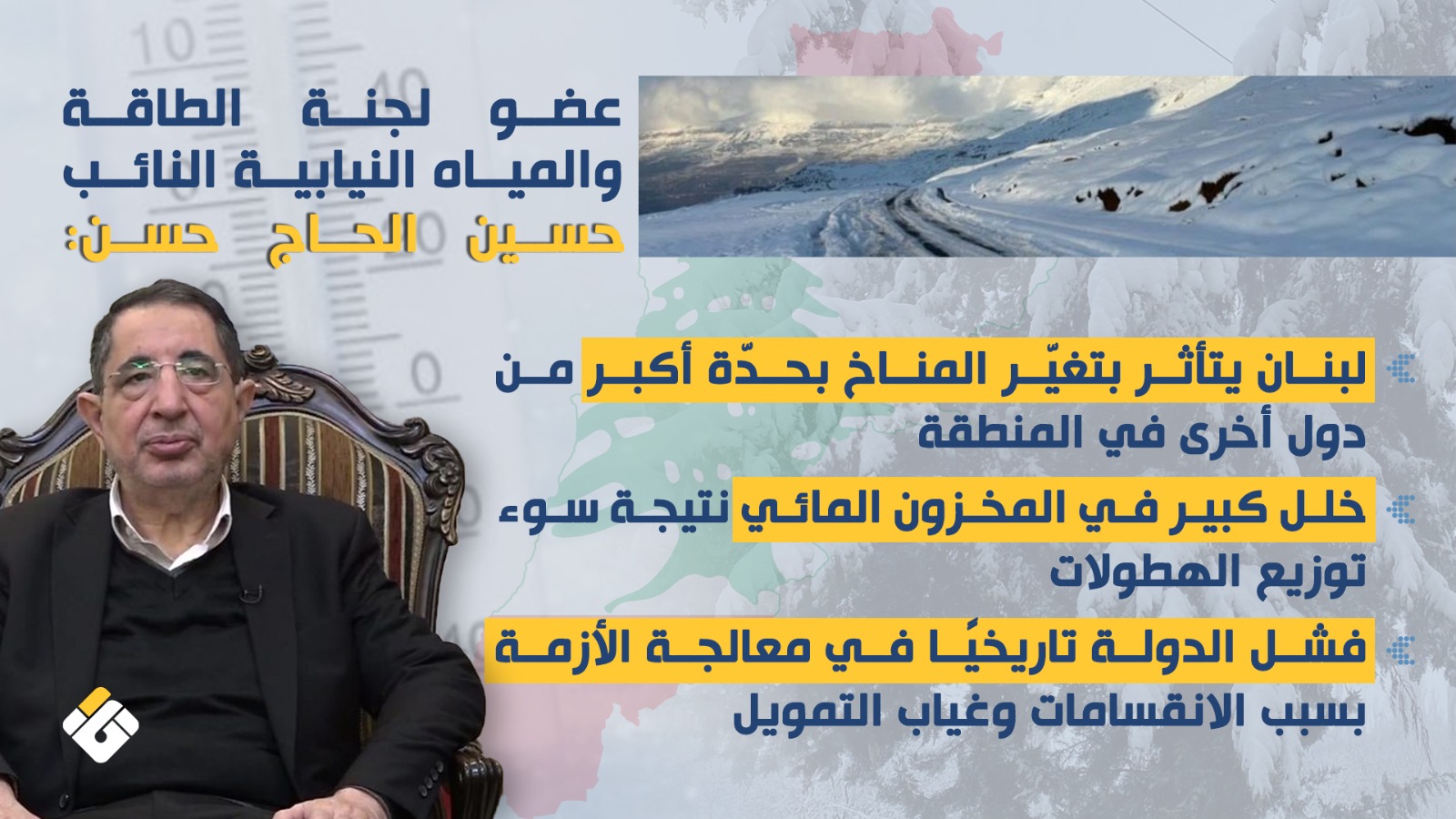 من جهته، قال عضو لجنة الطاقة والمياه النيابية، الدكتور حسين الحاج حسن، في تصريح لموقع «المنار»، إن لبنان، بوصفه جزءًا من منطقة الشرق الأوسط، يتأثر بتغيّر المناخ كغيره من دول العالم، ولكن بحدّة أشدّ. وأوضح أن البلاد تتعرّض لموجات تصحّر وتأثيرات مباشرة ناجمة عن تغيّر المناخ، ما أدّى إلى تراجع معدلات المتساقطات كمًّا ونوعًا.