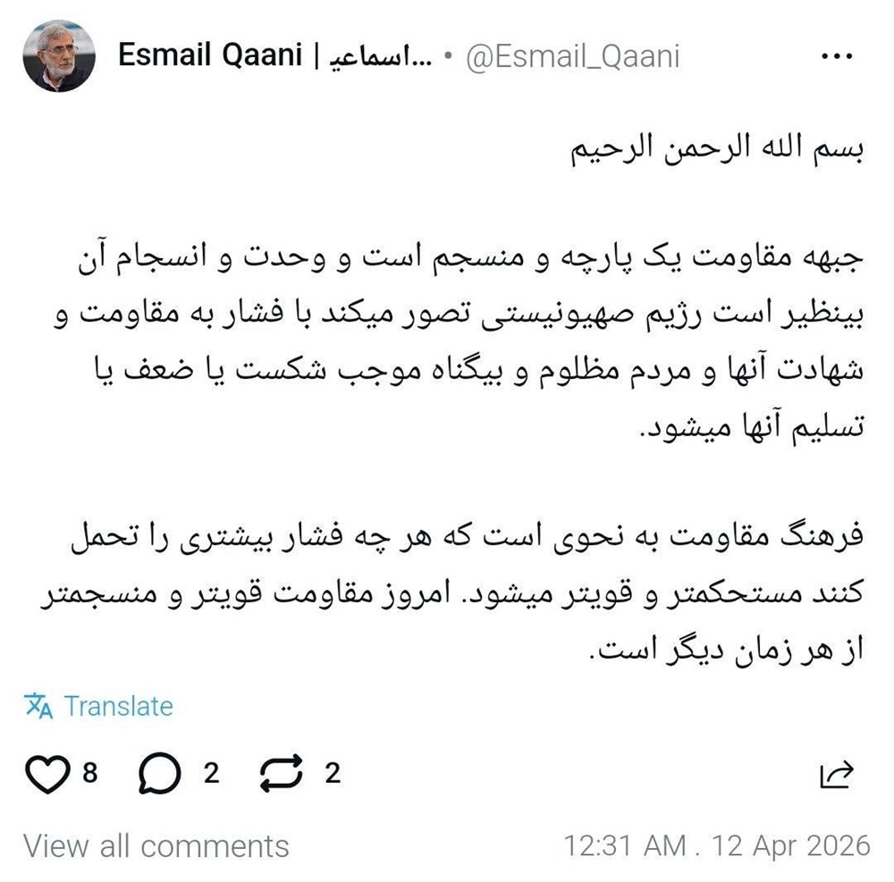 اعتبر قائد قوة القدس في حرس الثورة العميد إسماعيل قاآني “ان جبهة المقاومة موحدة ومتماسكة، وتتمتع بوحدة وانسجام لا نظير لهما”.